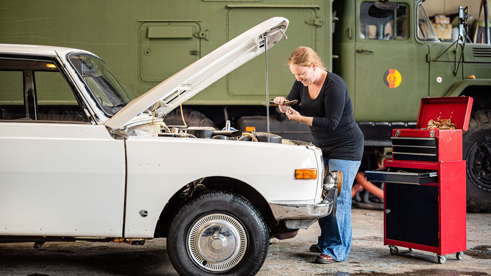 Jolien was niet technisch, maar knapte toch zelf haar oldtimer op. De oude Wartburg is een belangrijk onderdeel van haar hobby: geschiedenis naspelen.